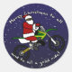 Frohe Weihnachten für alle - und für alle eine gute Fahrt! Der sonnige Santa Claus Cartoon fährt mit einem dreckigen Motorrad im schneebedeckten Himmel. Ideal für alle Motorradfahrer und Motorradfahrer.