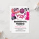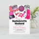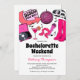 Junggeselinnen-Abschied-Einladungen für Cowgirl mit einer Auswahl an Retro-rosa-Gegenständen wie Diskothek, Plattenspieler, Cowgirl-Stiefel, Mikrofon, Cocktails und Rodeo-Hut, sowie eine moderne, unterhaltsame Bachelorette-Vorlage, die leicht zu personalisieren ist, inklusive einer Wochenendreise auf der Rückseite.