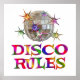 Ein Disco-Liebhaber weiß, dass Diskomusik und Tanz am besten sind. Teilen Sie Ihre Gefühle mit diesem farbenfrohen Design mit einer Diskothek, Sternen und den Worten - Disco Regeln.