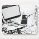 Dieses Mauspad verfügt über eine Violine, die an einen Amp angeschlossen ist, und einige Effekte Pedale.