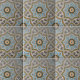 Die dekorative Keramik, die eine Mischung aus Modernität und Klassik ausstrahlt. Es zeichnet sich durch ein kompliziertes geometrisches Muster aus, das sowohl auffällig als auch raffiniert ist. Das Hauptmotiv des Designs ist eine symmetrische Anordnung aquamariner und weißer Blütenformen, die aus einem goldgelben Kreis ausstrahlen. Jedes Blatt ist in Gold umrissen und fügt der Kachel eine Touch Luxus hinzu. Um dieses zentrale Motiv herum sind graue Sechsecke mit zarten weißen Mustern, die an Frost oder Lakework erinnern. Die Kombination aus aquamarin, weiß und gold vor grauem Hintergrund schafft einen auffallenden Kontrast, der die Ästhetik der Kachel insgesamt verbessert. Diese Kachel wäre eine perfekte Ergänzung zu den verschiedenen Innenräumen, einschließlich Bädern und Küchen, die eine Touch von Eleganz und Eleganz hinzufügen.