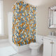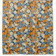 Ein lebendiges Blumenmuster bedeckt das gesamte Bild. Kleine, stilisierte Blume in Orange-, Hellblau- und Cremetönen sind dicht auf marineblau gehalten. Die Blume haben ein etwas unvollkommenes, malerisches Aussehen, mit Variationen in Farbsättigung und Form, die dem Muster ein strukturiertes, fast handgemaltes Aussehen verleihen. Das wiederholte Muster erzeugt einen fröhlichen und geschäftigen visuellen Effekt.