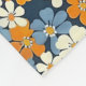 Ein lebendiges Blumenmuster bedeckt das gesamte Bild. Kleine, stilisierte Blume in Orange-, Hellblau- und Cremetönen sind dicht auf marineblau gehalten. Die Blume haben ein etwas unvollkommenes, malerisches Aussehen, mit Variationen in Farbsättigung und Form, die dem Muster ein strukturiertes, fast handgemaltes Aussehen verleihen. Das wiederholte Muster erzeugt einen fröhlichen und geschäftigen visuellen Effekt.