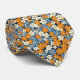 Ein lebendiges Blumenmuster bedeckt das gesamte Bild. Kleine, stilisierte Blume in Orange-, Hellblau- und Cremetönen sind dicht auf marineblau gehalten. Die Blume haben ein etwas unvollkommenes, malerisches Aussehen, mit Variationen in Farbsättigung und Form, die dem Muster ein strukturiertes, fast handgemaltes Aussehen verleihen. Das wiederholte Muster erzeugt einen fröhlichen und geschäftigen visuellen Effekt.