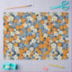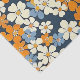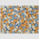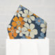 Ein lebendiges Blumenmuster bedeckt das gesamte Bild. Kleine, stilisierte Blume in Orange-, Hellblau- und Cremetönen sind dicht auf marineblau gehalten. Die Blume haben ein etwas unvollkommenes, malerisches Aussehen, mit Variationen in Farbsättigung und Form, die dem Muster ein strukturiertes, fast handgemaltes Aussehen verleihen. Das wiederholte Muster erzeugt einen fröhlichen und geschäftigen visuellen Effekt.