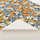 Ein lebendiges Blumenmuster bedeckt das gesamte Bild. Kleine, stilisierte Blume in Orange-, Hellblau- und Cremetönen sind dicht auf marineblau gehalten. Die Blume haben ein etwas unvollkommenes, malerisches Aussehen, mit Variationen in Farbsättigung und Form, die dem Muster ein strukturiertes, fast handgemaltes Aussehen verleihen. Das wiederholte Muster erzeugt einen fröhlichen und geschäftigen visuellen Effekt.