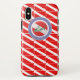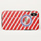 The red and white dive flag pattern in the background, and a circle with a rounded diving symbol with a shark design