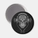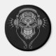 Ein aufwändiges DJ-Design mit Zuckerschädeln, das mit aufwändigen Wirbel und Punktmuster dekoriert ist. Kopfhörer sitzen oben auf dem Schädel und zwei Drähte hängen darunter. Die komplexen Linien und Kreise sind schwarz, während das Innere des Schädels mit hervorgehobenen Grautönen abgeschlossen ist. Musik strahlt aus den Kopfhörern in Form von grauen Blitzschrauben und dem reinen schwarzen Hintergrund. Dieser aggressive Tag des inspirierten Toten macht einen auffallenden Magneten