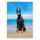 Ein niedlicher Doberman Hund sitzend mit farbenprächtigem Hintergrund, eine Geschenkidee für jemanden, der diesen Hund züchtet.
