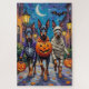 Adorable Dobermans, die in spielerischen Halloweenkostümen gekleidet sind, tragen Kürbiseimer, während sie unter dem mondbeleuchteten Himmel tricksen oder sich behandeln. Dieses festliche Design hebt die schlanke Bauweise der Rasse, die Alarmohren und die loyale Persönlichkeit hervor und prägt perfekt die spukhafte und doch lustige Atmosphäre Halloween-Abends. Eine kühne Feier für Hundefreunde und Halloween-Fans gleichermaßen.