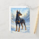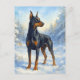 Ein schlanker Doberman Pinscher steht stolz in einem schneebedeckten Wald, seine warme Haltung und auffallende Markierungen kontrastieren wunderbar mit der ruhigen Winterlandschaft.