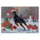 Ein schlanker Doberman läuft kräftig durch die schneebedeckte Winterszene und trägt einen festlichen roten Weihnachtshut. Dieses auffallende Design hebt das sportliche Gebilde der Rasse, die loyale Natur und die gefühlvolle Persönlichkeit hervor und erweckt gleichzeitig die Wärme und den Zauber der Urlaubssaison. Ein kühner Winterurlaub voller festlichen Charme.