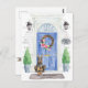 Mit unserer stilvollen Ankündigung kündigen Sie Ihre neue Adresse an: Doberman, blaue Haustür, Begrüßungstür, Schiefer-Schild, Topiaries und ein blumengeschmücktes Set auf grauem Backstein.