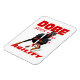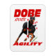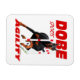 Ein energiegeladener, schwarzer Dobermann in den Webstöcken mit dem Dobe-Sportlogo auf einem flexiblen Foto-Magneten.