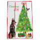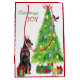 Auf jeder Seite dieser Holiday-Geschenktasche trägt ein Doberman Pinscher Hund einen roten Bandana-Schal, während er neben einem Holiday-Baum sitzt. Rund um den Hund herum gibt es leicht gewickelte Geschenkpakete. Auf dem Weihnachtsbaum landet eine Stierfinke. Der rote und grüne Text sagt "Christmas JOY".