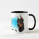 Ein wunderschönes Schwarz-Bein-Portrait des Doberman Pinscher Dog ist das Feature auf beiden Seiten dieser Tasse. Jedes Bild wird auf einem hellblauen Spatterhintergrund platziert. Zwischen den beiden Bildern ist der Text, der diesen treuen und mutigen Begleiter beschreibt, mit dem "DOBERMAN PINSCHER Hund" in schwarz unten. Der gesamte Text ist einfach auf alles angepasst, was Sie bevorzugen; beschreiben Sie Ihren eigenen treuen Freund!