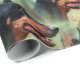 Leichter Cartoon-Effekt auf das Bild eines Doberman Pinscher Hundes mit zugeschnittenen Ohren vor einem holzgrünen Hintergrund. Ideal für den Dobermann Hundeliebhaber in Ihnen!