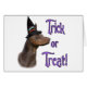 Wird es dieses Halloween Tricks oder Treats sein? In unserem Urlaubsdesign tragen Sie Ihren Lieblingshunde, den Doberman Pinscher, mit einem Hexenhut. Fügen Sie ein wenig 'Hocus Pocus' zu All Hallows' Eva in diesem Jahr hinzu!
