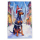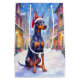Share festive holiday joy with this charming Christmas card featuring a Doberman Pinscher wearing a Santa hat in a glowing snowy village square. Twinkling storefronts, garland-wrapped lampposts, and gentle snowfall create a heartwarming watercolor winter scene perfect for dog lovers. The blank interior provides space for personalized messages, making it ideal for gifting, seasonal correspondence, and breed-themed collections.