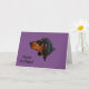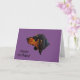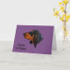 Dobermannpinscher-Hundegeburtstagskarte auf mutigem lila Hintergrund. Karte liest "alles Gute zum Geburtstag!" auf der Front und "vieler glücklichen Rückkehr" nach innen.