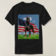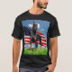 Ein hübscher schwarzer DobermannPinscher stehend vor einer wellenartig bewegenden amerikanischen Flagge mit einem blauen Himmel und flaumigen weißen Wolken hinter ihm. Zeigen Sie Ihren Stolz in Ihrer Zucht und in Land mit diesem Entwurf.