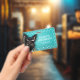 Ein niedlicher, schwarzer Miniaturschnauzer auf helltürkisfarben mit weißer Pfotenabdruck, dieses Abzeichen des Hundezüchters Business ID ist eine lustige Art, unsere Mitarbeiter zu identifizieren.