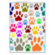 Überall drucken Bilder von Hundepfoten. Farbvolles Design im Cartoon. Kundenspezifische Grußkarten für Hunde-Partys und Veranstaltungen.