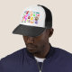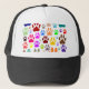 Überall drucken Bilder von Hundepfoten. Farbvolles Design im Cartoon. Gebrauchte LKW-Hüte. Geschenkidee für Hundefreunde jeden Alters.