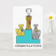 Drei Hunde mit Rosetten, die auf einem Podium stehend sind, haben eine Silbertasse in den Pfoten. Das Wort "Glückwunsch" steht unter dem Bild.