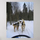 Blick während des Reitens in einem Schlitten, der von schönen & glücklichen Hunden in Quebec City, Quebec, Kanada gezogen wird. Hunde, die durch einen ruhigen Waldweg schlendern, war eines unserer Lieblingsziele auf unserer Reise nach Quebec. Foto wurde im Februar 2012 aufgenommen.