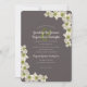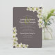 Dogwood Hochzeit Einladungen, um Linie für Linie. Die weißen Hundsholzblüten sind an den Kanten mit Maronrosa getönt und haben grüne, helle Mittelpunkte. Die Blume kaskadieren an den oberen und unteren Rändern. Dunkle Rauchfarbe ist der Hintergrund für hellrosa Schriftzeichen in modernem gebogenem Text und gedruckten Linien mit Zwischenräumen. Ein grüner Ampersand hält die Namen zusammen. Reverse hat ein lustiges grün-weißes wirbelndes Blume-Muster.