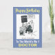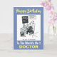 Der Doktor erhält eine Ausbildung an einer medizinischen Fakultät und lernt, ein Rezept zu schreiben. Geburtstagskarte für einen Arzt oder Doktor.