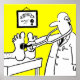 Ein Arzt benutzt sein Stethoskop auf den Füßen des Patienten. Ein lustiges medizinisches Poster hat einen Cartoon, der einen Patienten untersucht. Medizinischer Spaß in einem lustigen Poster.