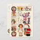 Niedliches Vintages Postkartenbild einer antiken Katze mit rosa Kleid und Mauspalast. Papierpuppen mit ausgeschnitt Kleidung und einem süßen Santa Clause Anzug für ein lächelndes Papierdolly.