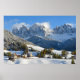 Plakatdruck des Dorfes St. Magdalena (Santa Maddalena) mit seiner Kirche im Villnoesstal in Südtirol, Italien, im Winter im Schnee.