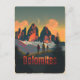 Eine faszinierende und nostalgische Darstellung des Wanderns in den Dolomiten, Italien, die die raue Schönheit und die dramatische Landschaft der Bergkette zeigt. Das Design umfasst Wanderer, die landschaftliche Wege inmitten von hohen Gipfeln, üppigen Wiesen und alpinen Seen durchqueren. Das Vintage Kunstwerk erinnert an das abenteuerliche und ruhige Erlebnis der Dolomiten und lädt die Besucher ein, sich in die atemberaubende Natur einzutauchen