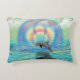 2 Delphine schwimmen im Meer in der Nähe eines schönen Aufstiegs von Farben und Wasser mit 2 Planeten, ein Mond und eine farbenfrohe Sonne. Rosa, blau, aqua, gelb und grün im Wasser und am Himmel.