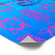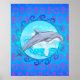 Dolphin springt durch ein Sonnensymbol von Maori mit blauem Ozean und Segelboot dahinter. Rosa Honu Schildkröten und rosa Ti Masken Muster über einen ozeanblauen Hintergrund.