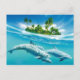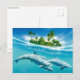 Tierausweis mit einer Gruppe von Delphinen, die vor einer paradiesischen Insel schwimmen.