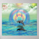 2 Delfine schwimmen im Ozean in der Nähe eines schönen Aufstiegs von Farben und Wasser mit 2 Planeten, einem Mond und einer farbenfrohen Sonne. Rosa, blau, aqua, gelb und grün im Wasser und am Himmel.