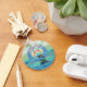 2 Delfine schwimmen im Ozean in der Nähe eines schönen Aufstiegs von Farben und Wasser mit 2 Planeten, einem Mond und einer farbenfrohen Sonne. Rosa, blau, aqua, gelb und grün im Wasser und am Himmel.