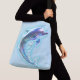Eine lebendige digitale Darstellung eines Delfins wird vor einem aquablauen Hintergrund anmutig überspringen. Der Delphin leuchtet in leuchtenden Farben und ist von stilisierten Wasserspritzen umgeben, die seine Dynamik verstärken.