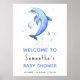 Ein kleines Stück unterwegs mit dieser Babydusche unter dem Thema Meer, mit Baby Delphin in sanft blauen Aquarellen. Wasserfarben-Wasserblasen