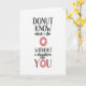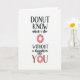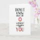 This greeting card features a white background with a sweet message running down the center. The text reads “DONUT KNOW what i do WITHOUT a daughter like YOU,” stacked in a tall layout from top to bottom. “DONUT KNOW” and “WITHOUT” are in thick, black block letters, while “what i do” and “a daughter like” appear in a softer, cursive-style script. The word “YOU” stands out near the bottom in warm brown block letters. Two donuts take the place of the letter “O,” and they look golden-brown with pink frosting and small dark sprinkles. The donuts add a cute, affectionate touch that fits the loving note to a daughter ❤️