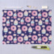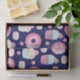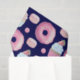 Süße Leckereien - Donuts mit rosafarbenen Glasseisungen, Kuchen in dunkelrosa und weißem Papiertücher mit hellrosa oder weißem Eis und mit Erdbeeren oder eisigen Blume und blassrosa Makaronen in einem sich wiederholenden Muster auf sehr dunkelblau.