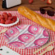 Ein Set aus Papier Tellern mit einer yummy Abbildung eines rosa mattierten Donuts mit bunten Sprinklen. Set auf einem glänzenden Vintagen pastellfarbenen lila und rosa gestreiften Hintergrund.