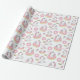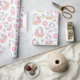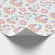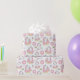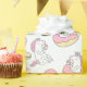 Ein wunderbar skurriles Muster von Donuts und Einhorntönen mit verstreuten Eistöcken, Kuchen und Keksen. Die Einhörner reiten auf einem rosa mattierten Donuts, während sie in ihrem fröhlichen Fest Eiscremes und Kuchen essen. Die Farben sind pastellrosa, gelb und weiß.