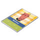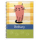 Niedliches Notebook für Katzenliebhaber. Auf einem gelben und orangefarbenen Aquarell-Karo ist eine orange doodle Kätzin. Unter ihm ist eine blaue Band mit weißen Buchstaben, um Ihren Namen oder anderen Text zu personalisieren. Unten ist ein grüner Raum mit hellgrünen Pfoten Drucke.