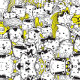 Eine doodle Kunstillustrierung mit einer dichten Sammlung von Cartoon-Katzen, schwarz-weiß mit gelben Akzenten dargestellt. Die Katzen werden in einem schlichten, skurrilen Stil gezeichnet, mit verschiedenen Ausdrücken und Posen, einigen Haltetassen oder Kleidungsstücken wie Brillen. Die Komposition ist dicht gepackt und schafft eine lebhafte, spielerische Szene. Der Stil erinnert an handgezeichnet Skizzen mit fetten Konturen und minimaler Schattierung, die durch den selektiven Einsatz von Gelb ergänzt werden, um bestimmte Elemente hervorzuheben.