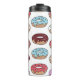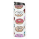 Doodle mehrfarbiger Donuts Hintergrund. Thermosbecher